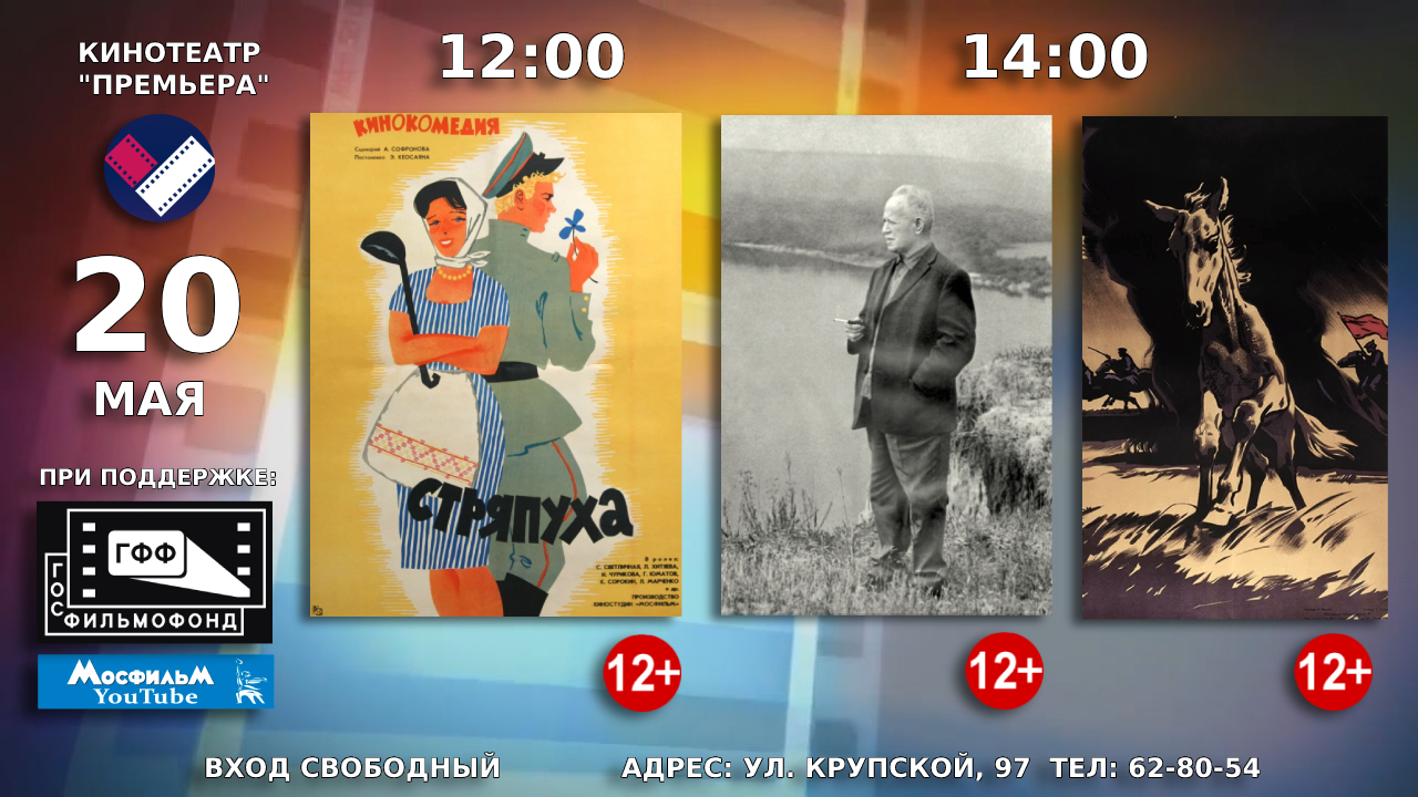 16 декабря кинотеатр «Премьера» приглашает на специальные показы советских художественных фильмов, приуроченные к юбилеям легендарных актёров. В 12:00 — «Уходя уходи» (1979, 12+) Показ посвящён 95-летию народного артиста РСФСР Николая Рыбникова —…