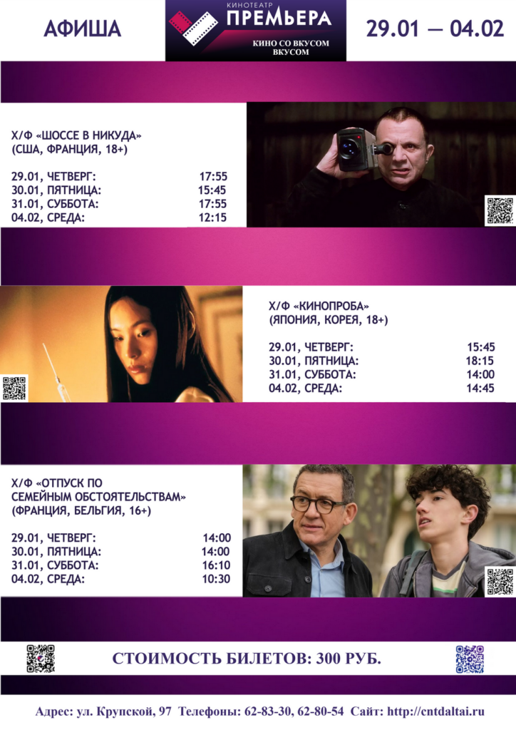Афиша кинотеатра «Премьера» Posted on 28.01.2026 By news Комментариев к записи Афиша кинотеатра «Премьера» нет Мероприятие