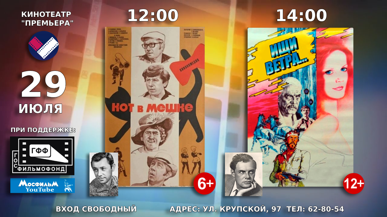 В 12:00 состоится тематический показ художественного фильма «Кот в мешке» (1978, 6+), посвященный 95-летию советского и российского актера театра и кино, кинорежиссера, автора и исполнителя песен, народного артиста РФ Олега Андреевича Анофриева.