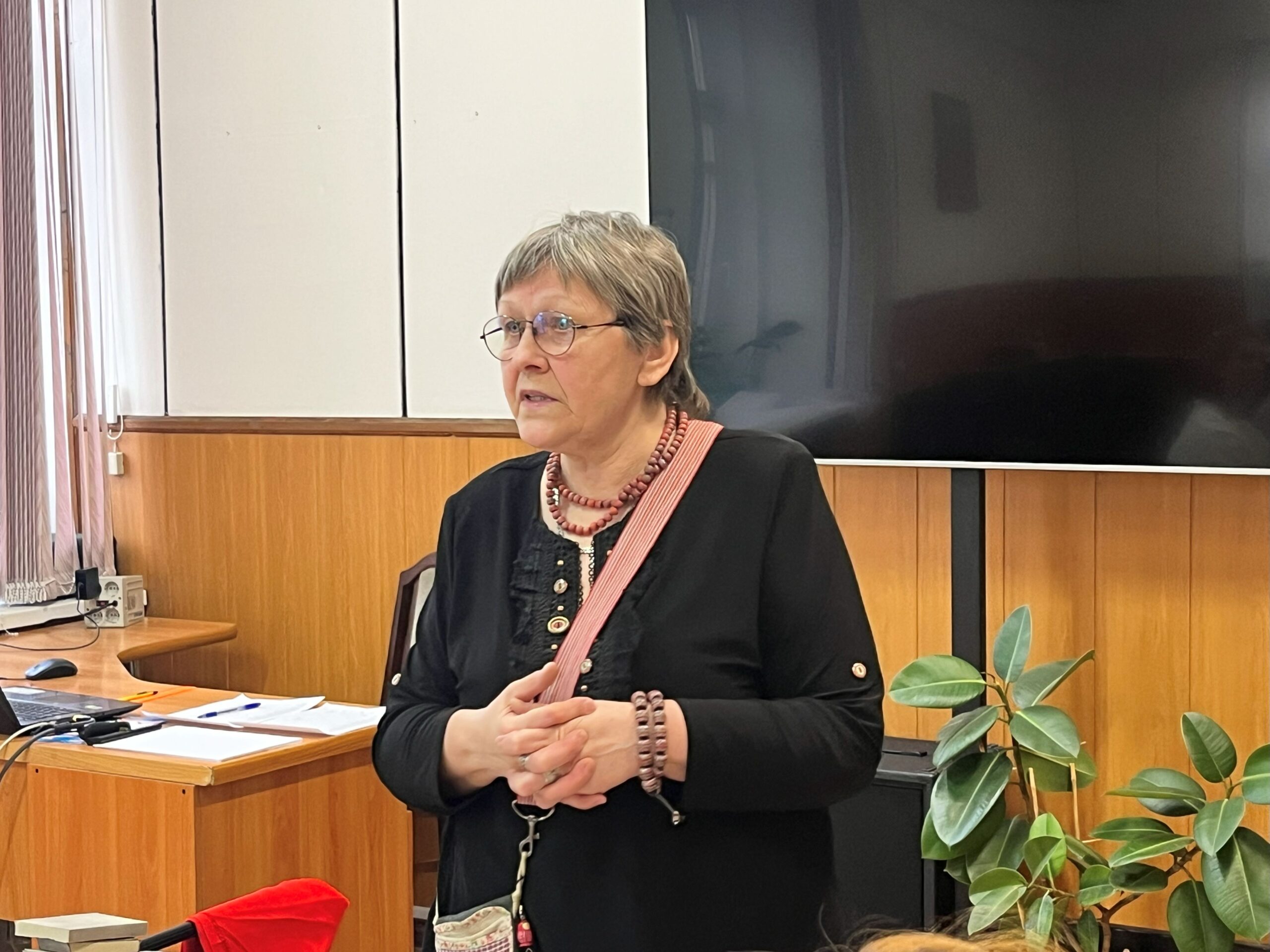 Народный мастер Алтайского края Елена Леонтьева погрузила слушателей в мир самобытной урало-сибирской росписи, показав, как создавать завораживающие орнаменты на примере «Чумышской двери», с акцентом на характерные цветовые решения и стилизацию.