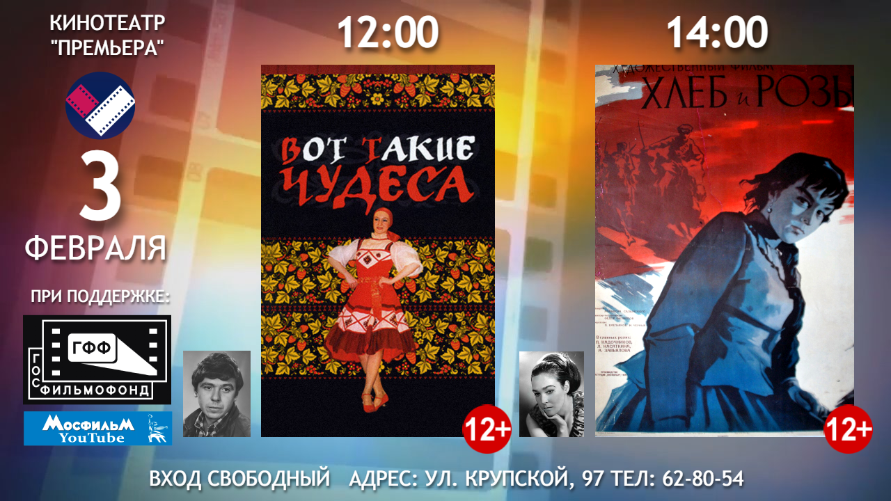 3 февраля в кинотеатре «Премьера» состоятся показы советских художественных фильмов «Вот такие чудеса» (1982, 12+) и «Хлеб и розы» (1960, 12+). Вход свободный.
