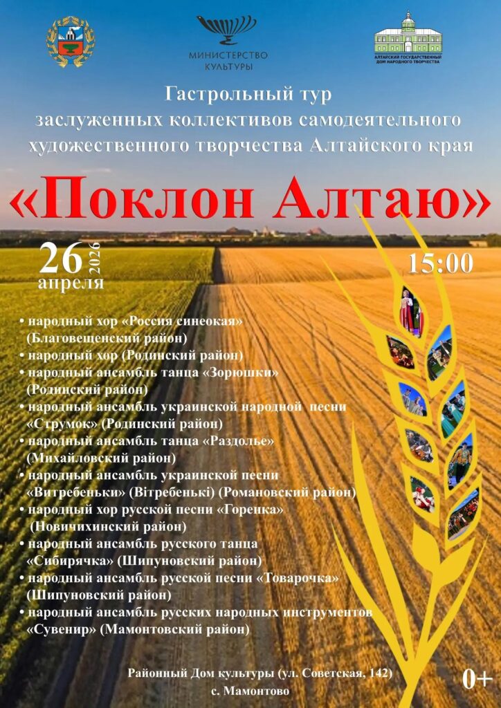Министерство культуры Алтайского края и Алтайский государственный Дом народного творчества проводят в 2026 году гастрольный тур «Поклон Алтаю». В нём принимают участие все коллективы, носящие звание «Заслуженный коллектив самодеятельного художественного творчества Алтайского края», — независимо от года его присвоения.