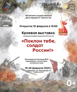 10 февраля в 15:00 в выставочном зале АГДНТ состоится открытие краевой выставки «Поклон тебе, солдат России!», посвященной Дню защитника Отечества.