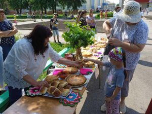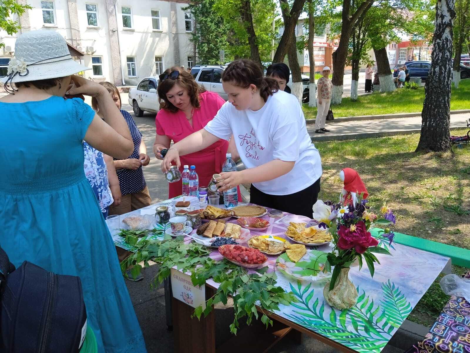В жаркий летний день село Топчиха на время стало блинной столицей Блинного государства во главе с хозяйкой праздника Матрёной Сметановной и хозяином Самоваром, да тремя шутниками-балагурами Скоморохами. На улице Блинной можно было оценить оформление столов, продегустировать блины и с начинкой, и без начинки, увидеть и самый большой, и самый маленький блинок, и самый тоненький, ажурный.
