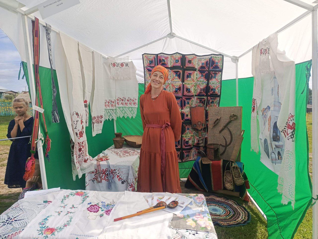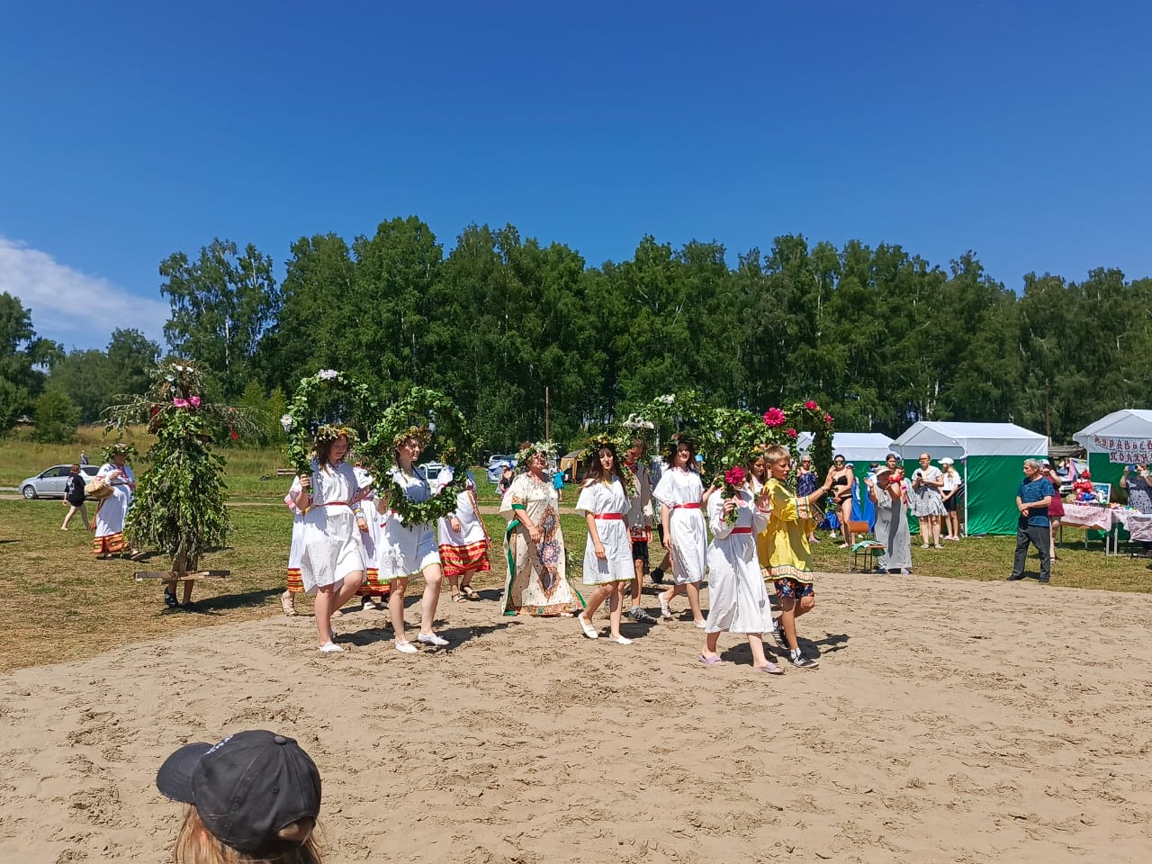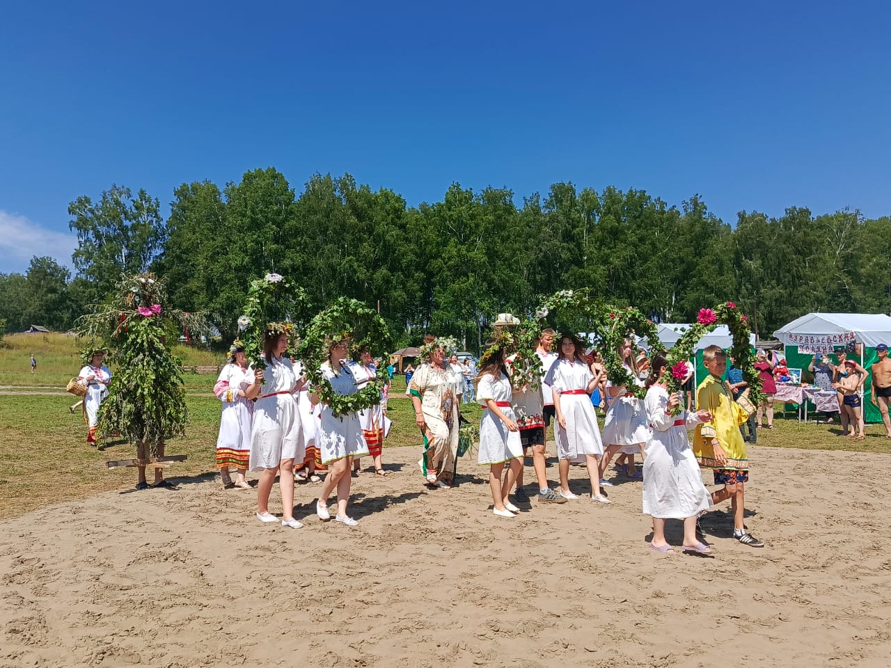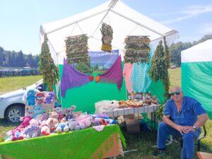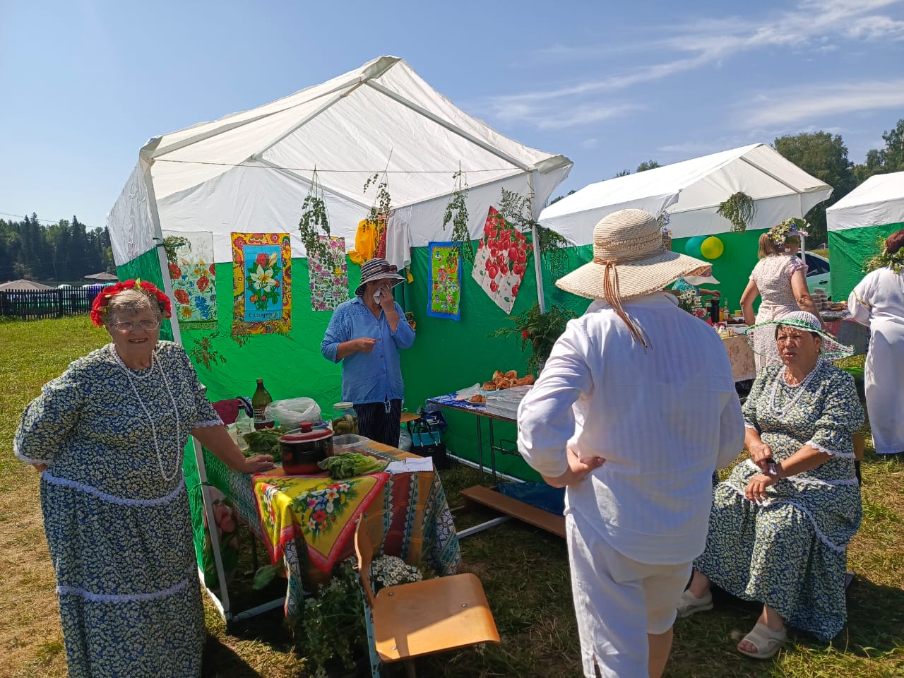 Вокруг сцены были расположены палатки с ярмарками и мастер-классами, где гости могли познакомиться с ремеслами и традициями нашего округа. Мастер-класс по плетению венков провели специалисты Думчевского СДК и Кордонского СДК. Выставку-продажу изделий декоративно-прикладного творчества организовали Муравьёвский, Кордонский и Большекалтайский СДК, а также Центральный дом культуры. Также состоялась выставка-дегустация русской кухни, в которой участвовали Черёмушкинский СДК, Малокалтайский КС и Большекалтайский СДК. В выставке-продаже куколок «Купальница» принимали участие сотрудники Пещёрской библиотеки. Вырученные средства были переданы волонтерам села Пещёрка, которые изготавливают сети для наших ребят, находящихся на специальной военной операции. Волонтерская группа «Своих не бросаем» организовала палатку для сбора средств на СВО.