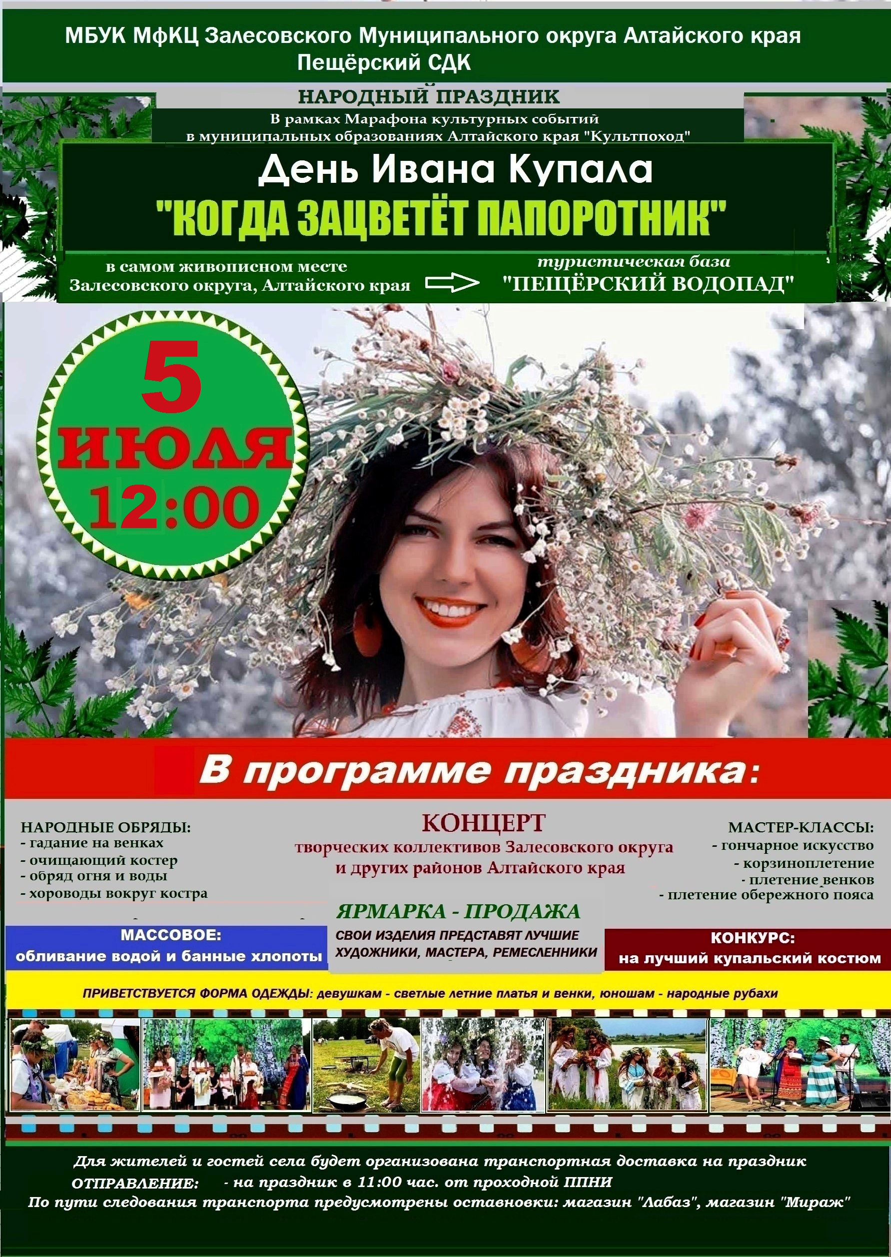 5 июля 2025 года в 12:00 база отдыха «Пещерский водопад» в селе Пещерка (Залесовский район, Алтайский край) распахнет свои двери для тех, кто жаждет прикоснуться к древним традициям и окунуться в атмосферу мистики на празднике «Когда зацветет папоротник».