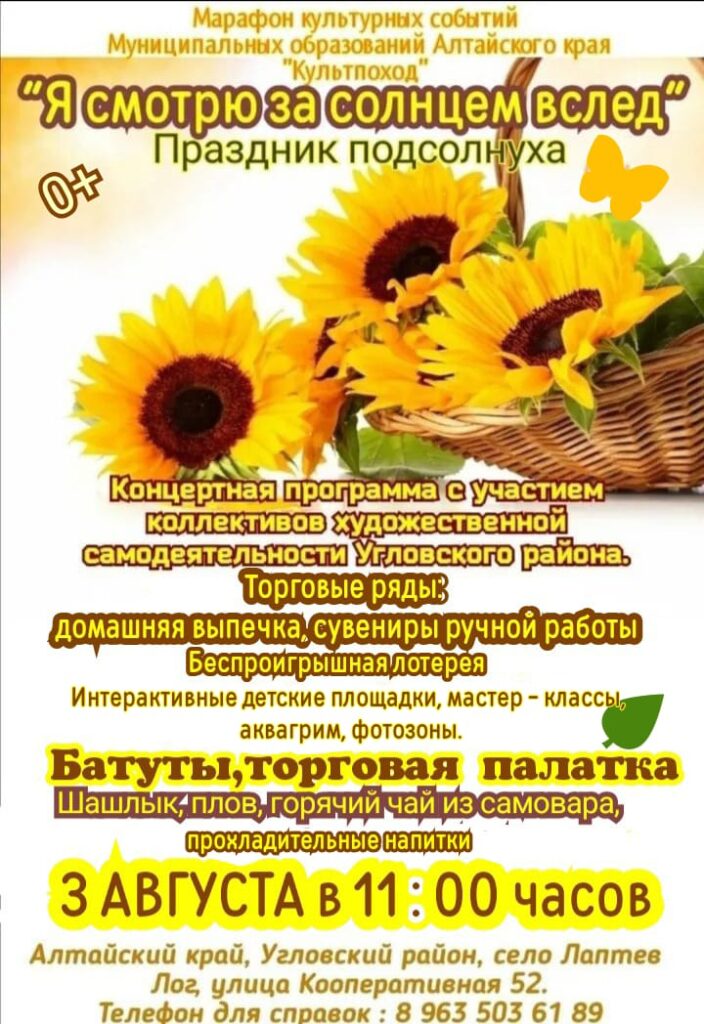 Приглашаем вас на праздник Подсолнуха «Я смотрю за солнцем вслед», который пройдет 3 августа 2025 года в селе Лаптев-Лог Угловского района! Этот праздник является символом лета, солнечного тепла и основой сельскохозяйственной культуры нашего региона.
